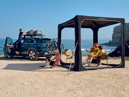 Experience unforgettable outdoor adventures: with the inflatable canopy tent from Porsche. Set up your home-from-home, anywhere.